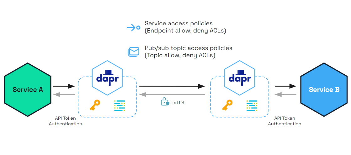 Dapr provides end-to-end security with the service invocation API, with the ability to authenticate an application with Dapr and set endpoint access policies. This is shown in the diagram below.