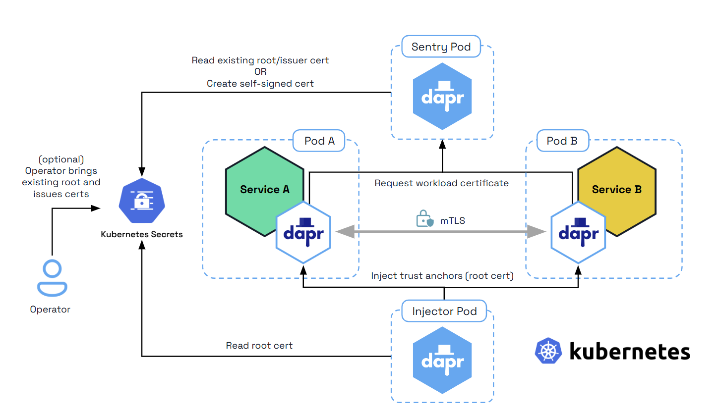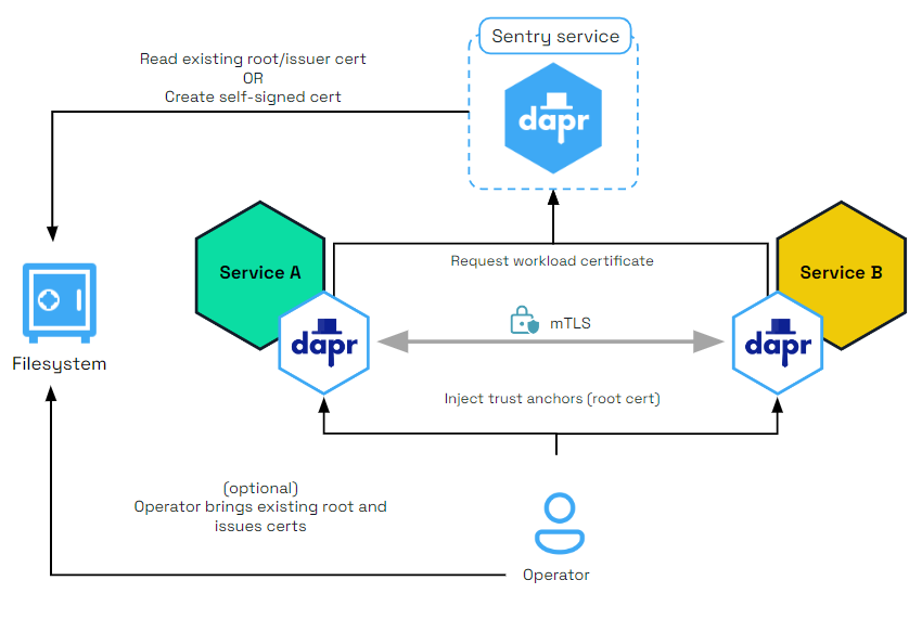 Dapr includes an “on by default”, automatic mTLS that provides in-transit encryption for traffic between Dapr sidecars. To achieve this, Dapr leverages a system service named Sentry, which acts as a Certificate Authority (CA)/Identity Provider and signs workload (app) certificate requests originating from the Dapr sidecar.