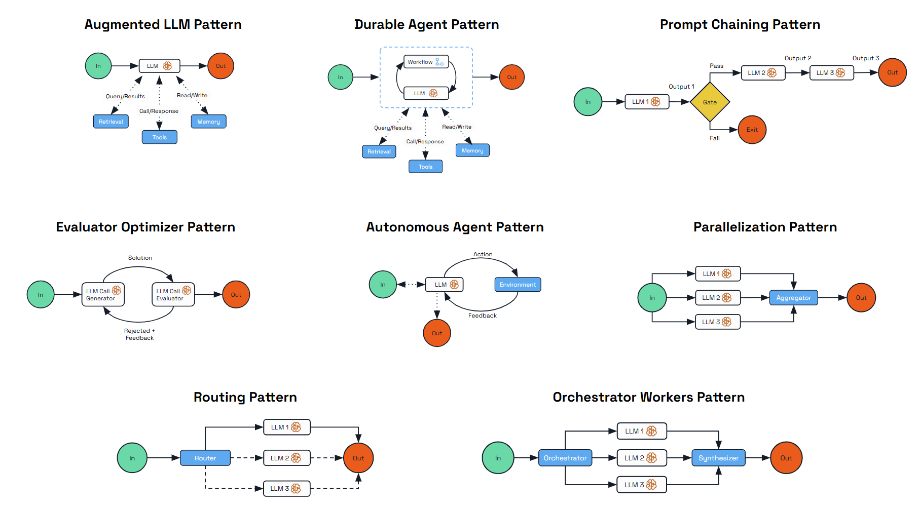 The patterns in this documentation start with the Augmented LLM, then progress through workflow-based approaches that offer predictability and control, before moving toward more autonomous patterns. Each addresses specific use cases and offers different trade-offs between deterministic outcomes and autonomy.