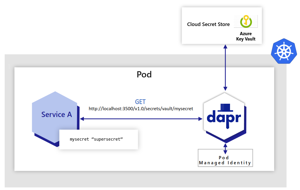 In Azure, you can configure Dapr to retrieve secrets using managed identities to authenticate with Azure Key Vault. In the example below: