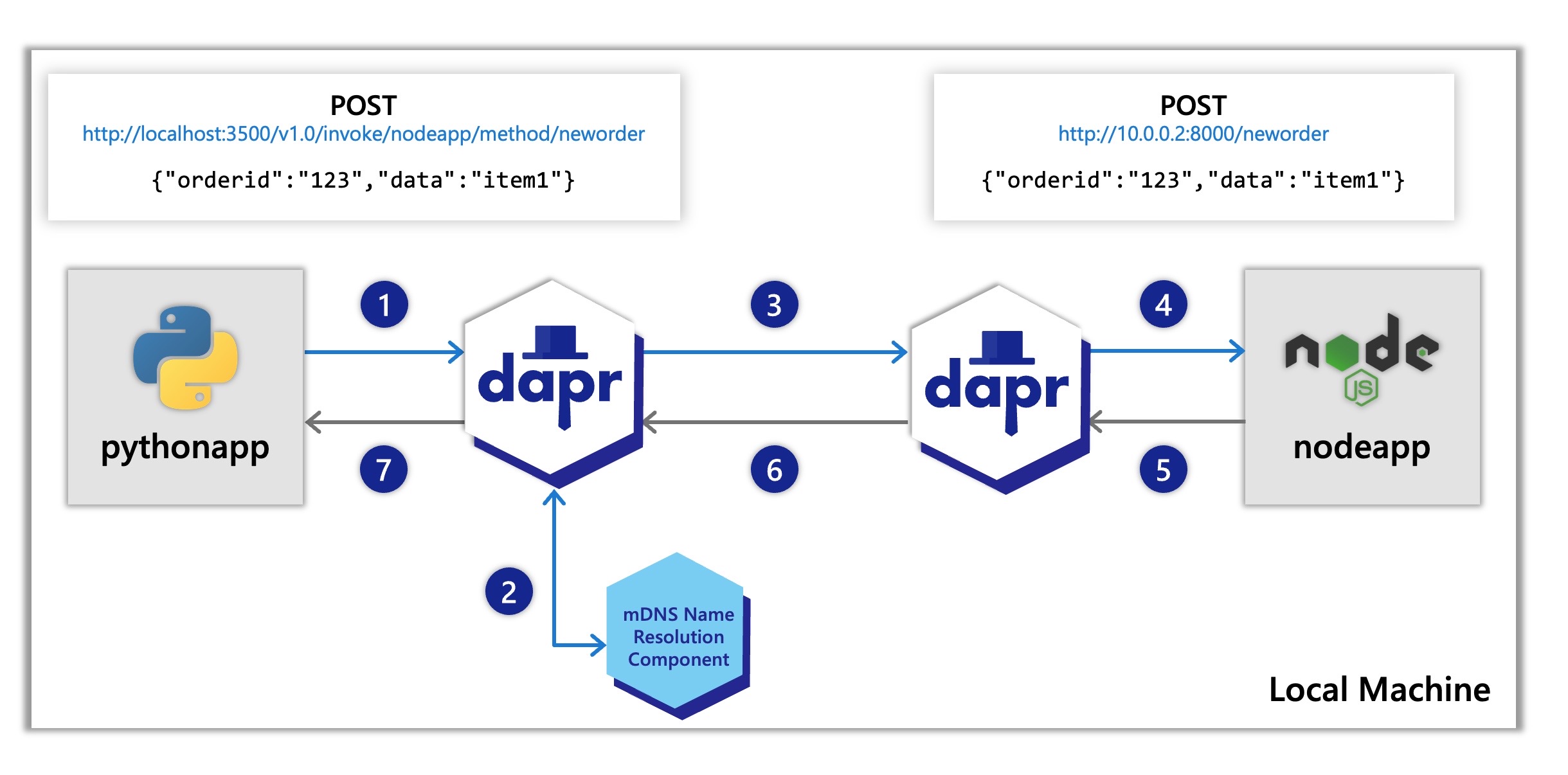 nodeapp. The python app invokes the Node.js app’snewordermethod by POSTinghttp://localhost:3500/v1.0/invoke/nodeapp/method/neworder, which first goes to the python app’s local Dapr sidecar. - Dapr discovers the Node.js app’s location using name resolution component (in this case mDNS while self-hosted) which runs on your local machine.