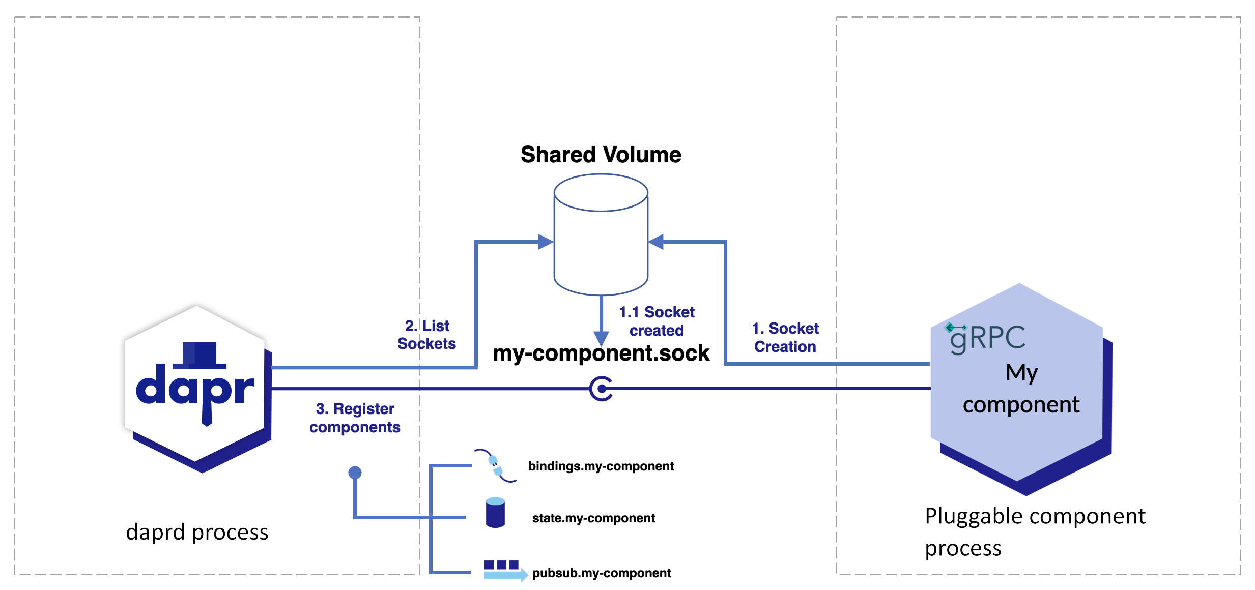 Pluggable, gRPC-based components are typically run as containers or processes that need to communicate with the Dapr runtime via Unix Domain Sockets (or UDS for short). They are automatically discovered and registered in the runtime with the following steps: